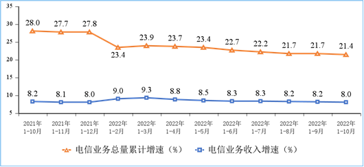 11月21日,工信部发布《2022年1-10月份通信业经济运行情况》。报告指出,1—10月份,信息通信行业运行平稳。电信业务收入保持稳步增长,电信业务总量较快增长;“物超人”步伐持续加大,5G、千兆光网等新型基础设施建设稳步推进;云计算等新兴业务快速增长,行业发展新动能不断释放。