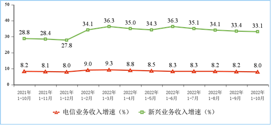 新兴业务收入保持快速增长。三家基础电信企业积极发展IPTV、互联网数据中心、大数据、云计算、物联网等新兴业务,1—10月份共完成相关业务收入2563亿元,同比增长33.1%,在电信业务收入中占比为19.4%,拉动电信业务收入增长5.2个百分点。其中云计算和大数据收入同比增速分别达127.8%和59.3%,数据中心业务收入同比增长12.7%,物联网业务收入同比增长25.6%。