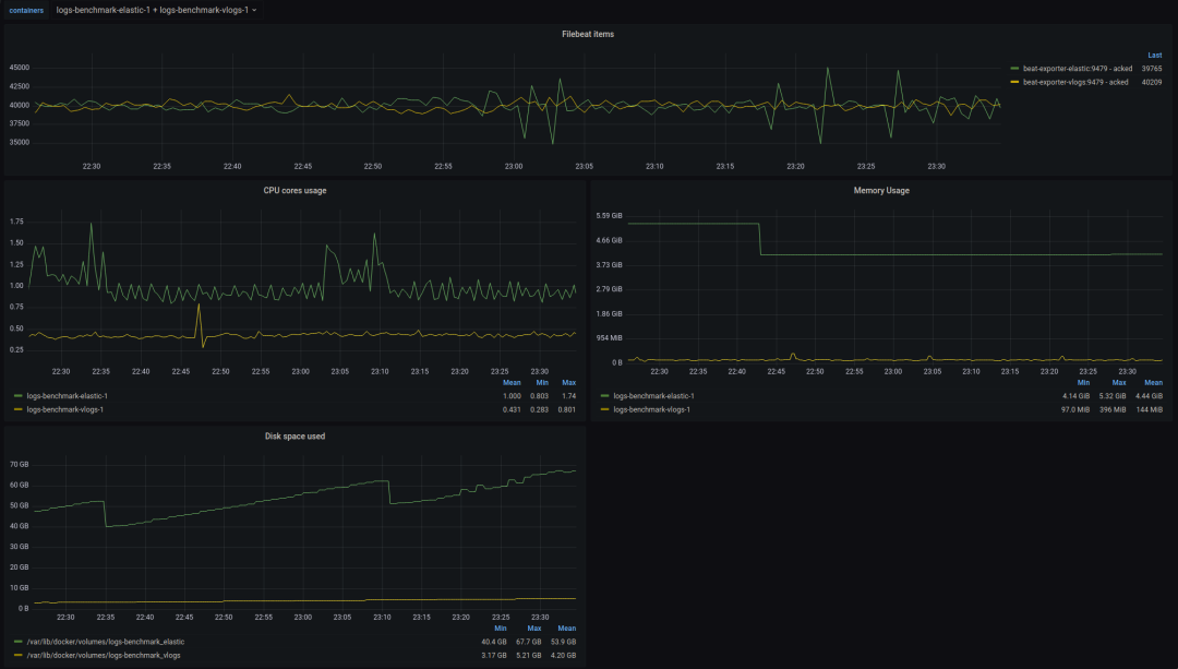 另外在 资源占用 方面,我们可以直接看 VictoriaLogs提供的[benchmark]: https://github.com/VictoriaMetrics/VictoriaMetrics/tree/master/deployment/logs-benchmark 结果。对比Elasticsearch,从下图可以看出: