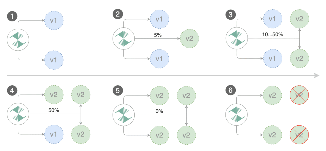 灰度发布也叫金丝雀部署 ,是指通过控制流量的比例,实现新老版本的逐步替换。比如对于服务 A 有两个版本(蓝和绿两个版本),当前两个版本同时部署,但是 version1 比例 90% ,version2 比例 10% ,然后我们可以观察 version2 的实际运行效果,如果符合预期,则可以逐步调整流量占比,比如调整为 80:20 -> 70:30 -> 10:90 -> 0:100 ,最终 version1 版本下线,全部替换成 version2 版本。如果验证失败,切换 100%流量回 v1 版本(回滚)。灰度发布的特点是: