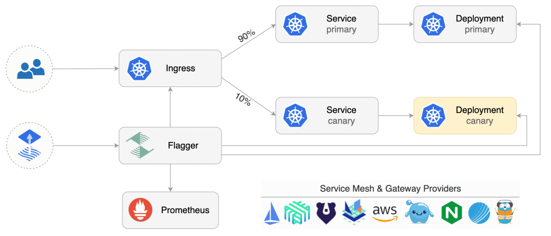 Flagger 可以使用 Kubernetes CRD 进行配置,并且与任何为 Kubernetes 制作的 CI/CD 解决方案兼容。由于 Flagger 是声明性的对 Kubernetes 事件做出反应,因此它可以与诸如此类的工具一起在 GitOps 管道中使用。
