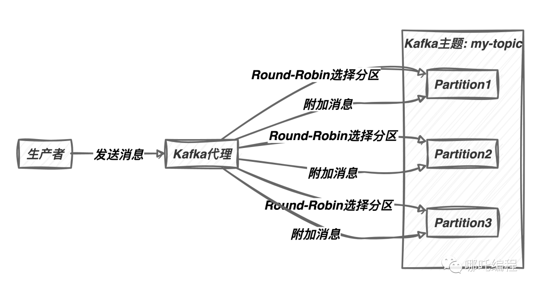 Kafka默认的分区策略是Round-Robin。这意味着当生产者将消息发送到主题时,Kafka会循环选择每个分区,以便均匀分布消息。