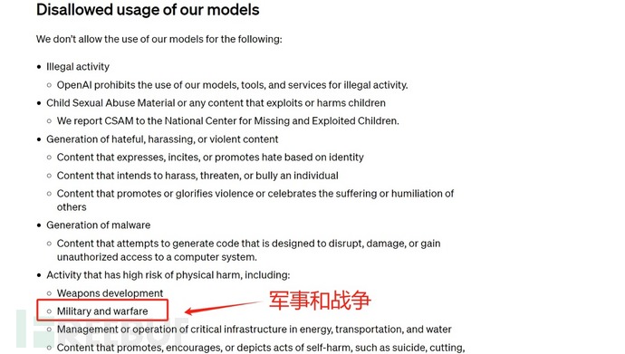 在上周的修改后,OpenAI在“通用政策”条款中虽然也有“不要使用公司服务伤害自己或他人”,并明确表示禁止“AI开发或操纵武器”,但军事这一关键限制性词汇,却从政策中消失了。