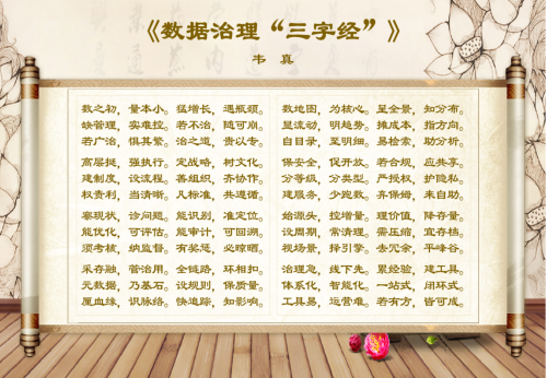 数据治理“三字经” 韦 真 数之初,量本小。猛增长,遇瓶颈。 缺管理,实难控。若不治,随可崩。 若广治,惧其繁。治之道,贵以专。 高层挺,强执行。定战略,树文化。 建制度,设流程。善组织,齐协作。 权责利,当清晰。凡标准,共遵循。 察现状,诊问题。能识别,准定位。 能优化,可评估。能审计,可回溯。 须考核,纳监督。有奖惩,必晾晒。 采存融,管治用。全链路,环相扣。 元数据,乃基石。设规则,保质量。 厘血缘,识脉络。快追踪,知影响。 数地图,为核心。呈全景,知分布。 显流动,明趋势。摊成本,指方向。 自目录,至明细。易检索,助分析。 保安全,促开放。若合规,应共享。 分等级,分类型。严授权,护隐私。 建服务,少跑数。弃保姆,来自助。 始源头,控增量。理价值,降存量。 设周期,常清理。需压缩,宜存档。 视场景,择引擎。去冗余,平峰谷。 治理急,线下先。累经验,建工具。 体系化,智能化。一站式,闭环式。 工具易,运营难。若有方,皆可成。 |