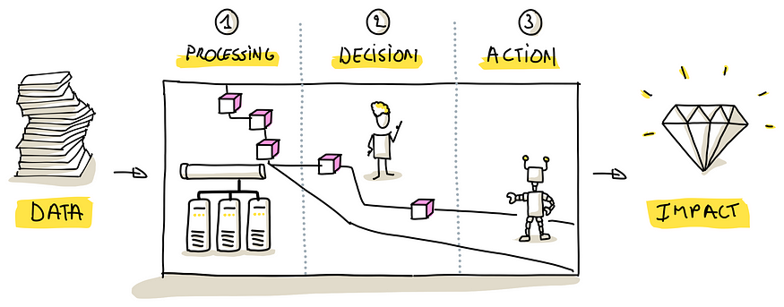 数据影响框架说明了这三个参与者如何协作将原始数据转化为切实的结果。最初,自动化管道处理和准备数据产品。接下来,人分析这些数据并做出明智的决策,从而采取有影响力的行动。人工智能和自动化管道可以帮助人无缝优化决策过程。在某些情况下,整个数据到行动的过程可以通过管道和人工智能完全自动化,无需任何人工干预。