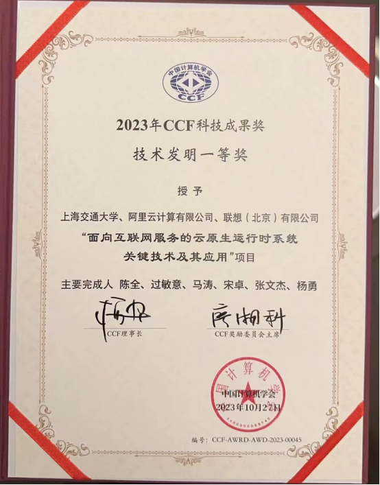 10月27日,中国计算机学会(CCF)公布了我国计算机科技领域最具权威性的科技奖项——2023年度“CCF科技成果奖”评选结果,共有41个项目荣获2023年度CCF科技成果奖。由联想集团与上海交通大学等共同研究开发的《面向互联网服务的云原生运行时系统关键技术及其应用》荣获了CCF科技成果奖技术发明一等奖。