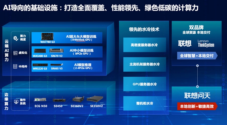 据介绍,联想AI导向的基础设施具备AI赋智、绿色赋能两大特征。“AI赋智”即让100%算力基础设施产品支持AI,50% 基础设施研发投入在AI领域,全面AI技术覆盖全域AI应用;“绿色赋能”即全面布局和引领液冷技术,打造液冷集群方案灯塔,以绿色算力基础设施助推智算产业可持续发展。目前,联想的液冷技术覆盖了风液冷混合、全液冷、整机柜液冷等主流液冷技术。