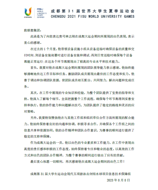 为表彰本次联想方案服务大运会支持团队的专业勤勉与突出贡献,成都大运会现代五项水球项目信息技术保障组特意向以林志刚为代表的11名联想服务人员致感谢信。