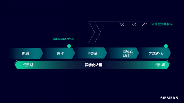那么,企业应该如何迎接2024年的挑战并为之做好准备?关键是要跳出眼前的行业压力波动,采取正确的战略手段,让自身变得更有弹性、更灵活、更能适应变化,而实现这一目标的最佳途径无疑就是数字化。数字化能够帮助企业在现实和数字世界中管理业务,这种现实与数字的结合解锁了一种关键资源 —— 数据。数据流通可以贯穿整个生产环节,然后发展出更高层次的功能,比如:数据管理自动化、产品和流程的闭环优化等等。数字化转型的过程主要体现于五个关键阶段,包括配置、连接、自动化、生成设计和闭环优化。