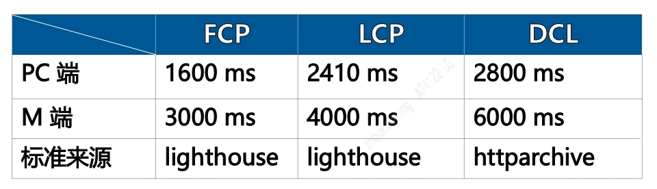 我们参考Lighthouse 50 分线 和 HTTP Archive 站点统计数据,根据应用类型是 PC 或 M 来制定慢页面标准,具体阈值如下:
