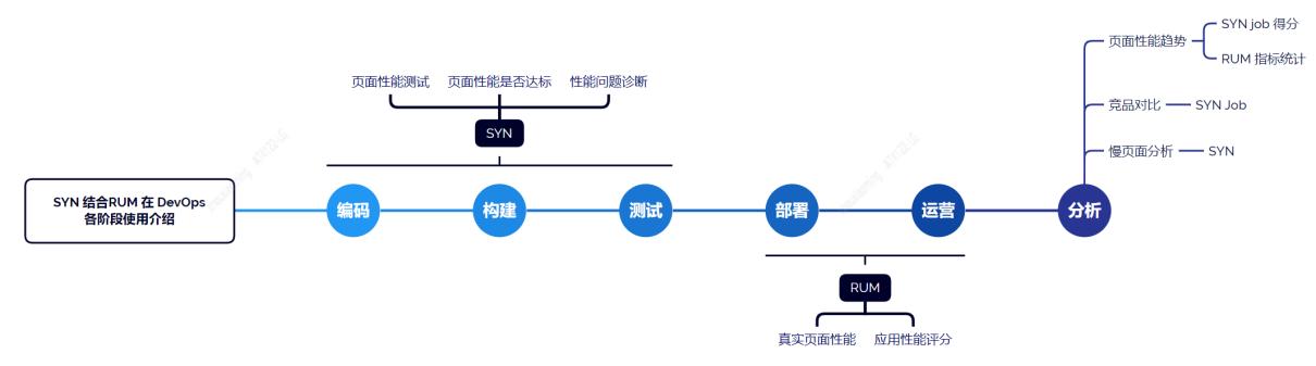 前文深入分析了 SYN 和 RUM 各自特点、使用方法及优缺点等,我们发现 SYN 和 RUM 各有所长、无法替代,最好同时引用 SYN 和 RUM,构建体系化性能监控架构,提供性能监控和性能分析工具链,支持产研同学在 devpos 各阶段中发现和定位页面性能问题。