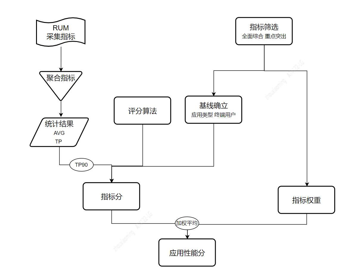获取应用性能分过程中涉及几个重要流程:1) 指标筛选及权重设置;2) 选择评分算法;3) 确立指标基线;4) 使用加权平均算法计算应用性能分。下面逐一介绍。