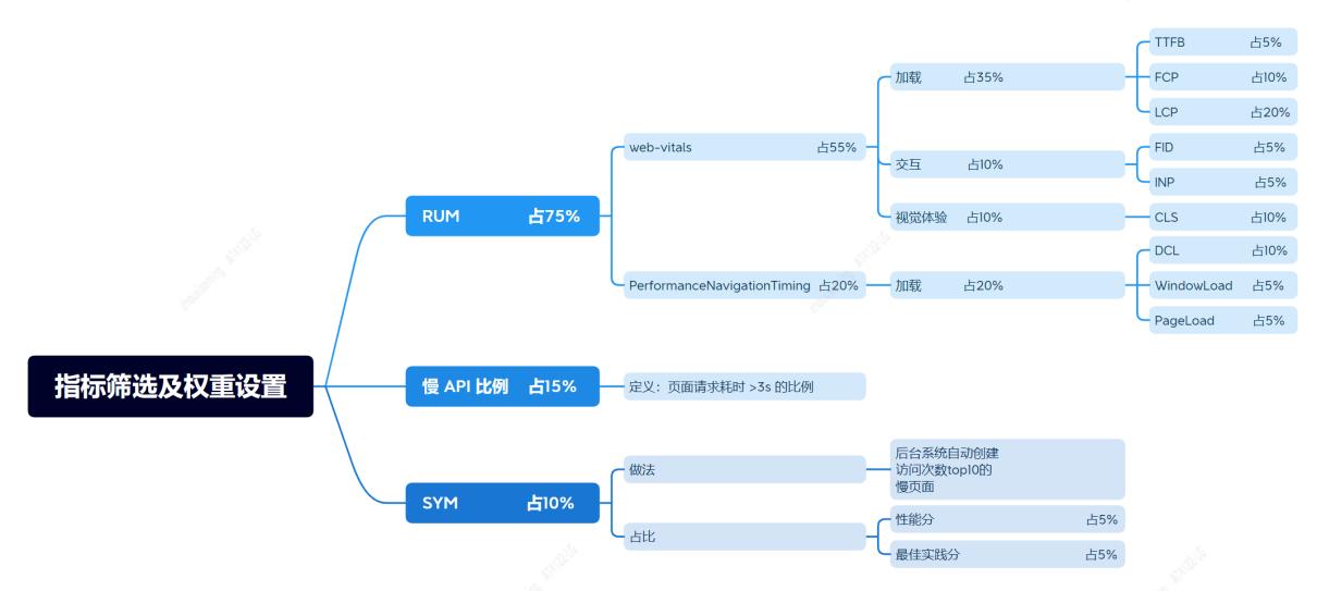 全面综合考虑。页面性能涵盖多方面,传统上只用首字节、白屏、首屏时间等少数指标来衡量,较为片面,不够客观。我们认为评判页面性能应该涵盖各维度指标,如:页面加载、交互体验和视觉体验。此外我们还引入慢 API 比例的概念,API 请求比例指页面打开后 API 耗时超过 3s 的请求比例,慢 API,即可能影响首屏加载耗时,也会影响交互过程中的用户体验。为了让研发同学关注慢页面、将在线 SYN 作为日常开发性能评估工具,我们将 SYN 评分也作为权重指标,后台系统每天会统计访问次数 TOP10 的慢页面并自动创建 SYN 定时任务,待任务执行、分析完毕后,将优化建议和诊断结果通知研发同学。SYN 评分项,包含性能分和最佳实践分,两者都是百分制。