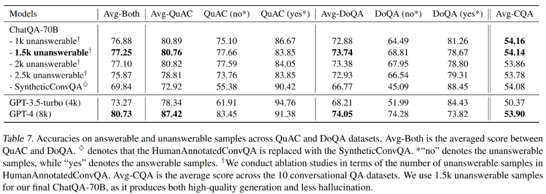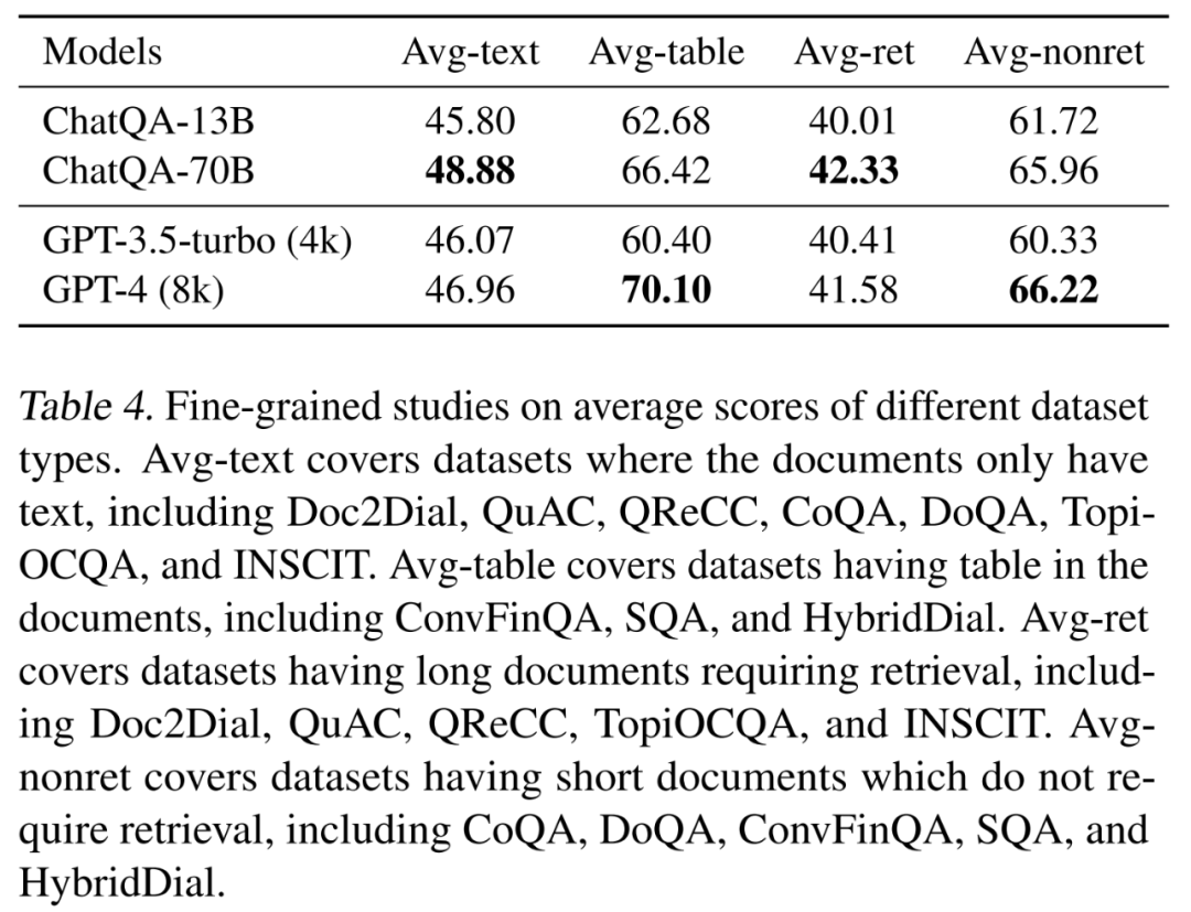 10 个数据集的人类评估结果如表 3 所示。首先,在大多数情况下(占比 69.09%),ChatQA-70B 模型和 GPT-4 表现相当。而 GPT-4 在胜率上略高于本文模型,大约高出 3.3%。这进一步证明了其模型在提供正确答案方面具有强大的能力。其次,在 ConvFinQA 任务中,本文模型比 GPT-4 有略微更好的胜率,这显示了该模型在算术计算方面的强大能力。第三,GPT-4 在 SQA 任务上的胜率明显更高,这表明在表格推理任务上,本文模型与 GPT-4 之间仍存在一定差距。