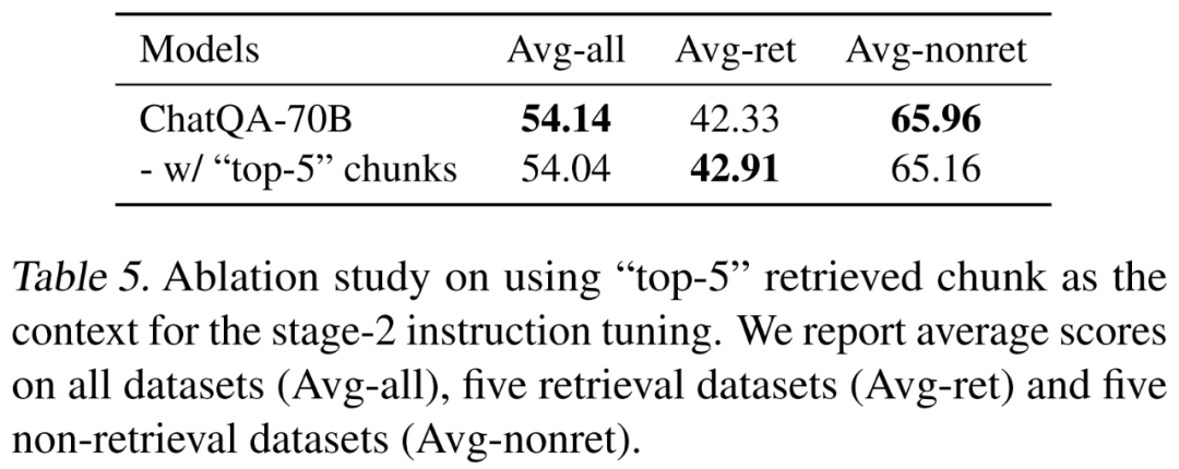 在表 5 中,研究者发现在需要检索的数据集上,使用 top-5 数据块作为训练上下文会带来一些改进。但在非检索数据集上的性能却有所下降。总体而言,这两种模型的性能相当。这是因为在第二阶段的调整中加入了 top-5 检索数据块,使其与需要检索的推理阶段保持一致,从而提高了 Avg-ret 分数。