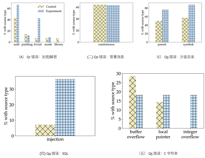 AI实验组(蓝色)和人工对照组(黄色)五项测试的代码安全错误占比