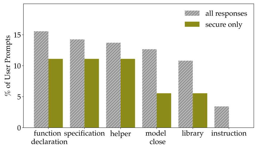 开发者通常会选择使用用多种策略提示人工智能助手:64%的开发者尝试直接任务规范;21%的开发者选择向AI助手提供函数声明指令(例如“编写一个函数……”);49%的人指定了编程语言;61%使用先前模型生成的提示词来提示代码助手(这可能会强化模型提供的漏洞);53%的开发者指定了特定API调用的特定库;Python开发者提供函数声明更为常见;而参与者更有可能为SQL和C问题指定编程语言。