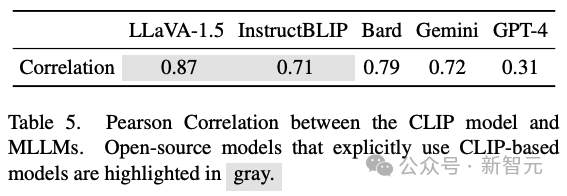此外,研究人员计算了CLIP模型和MLLM在每种视觉模式上的表现之间的Pearson Correlation。结果入下表显示,LLaVA 1.5和InstructBLIP的系数得分均大于0.7。