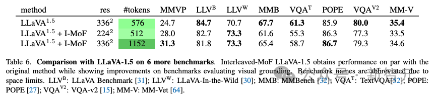 研究人员还在MMBench和GQA等其他基准上评估了交错特征混合方法,发现交错特征混合方法在这些基准上也实现了相似的性能。