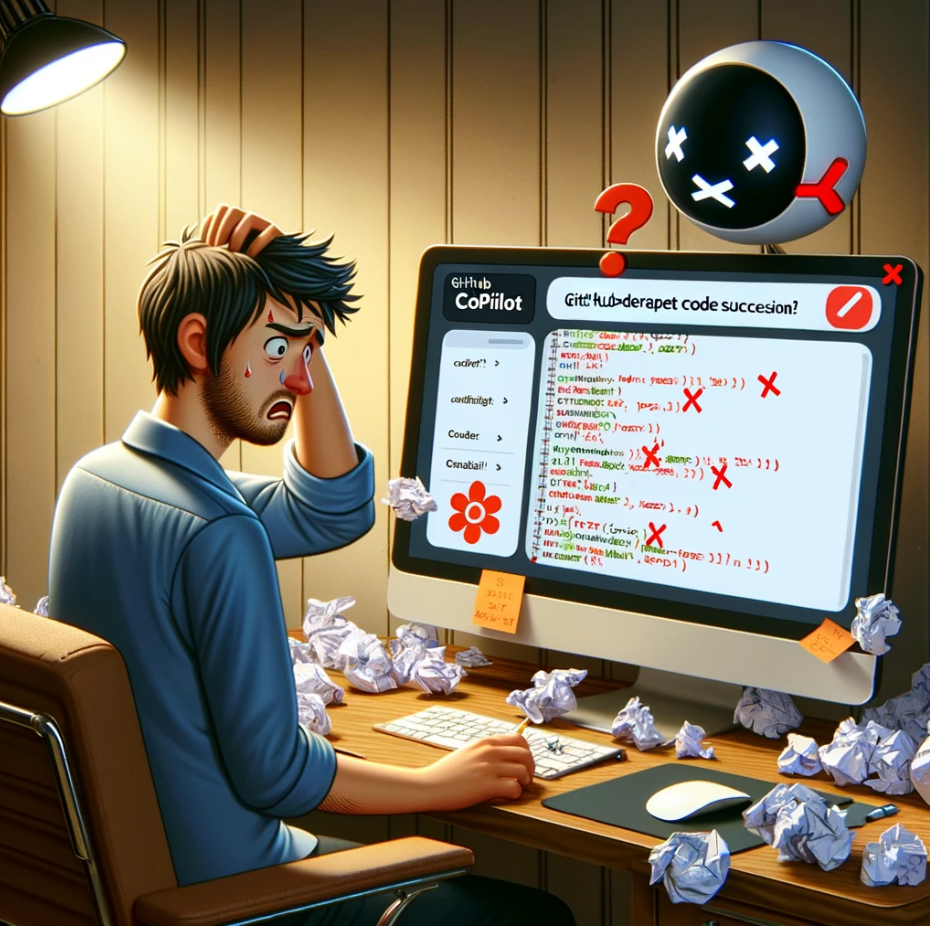 (prompt:A programmer is sitting at a computer desk, looking confused and frustrated. The computer screen shows a code editor with a pop-up window of GitHub Copilot suggesting incorrect code, symbolized by red error indicators and crossed-out lines in the code. The programmer is scratching their head, surrounded by crumpled paper, indicating multiple failed attempts. The scene conveys a sense of challenge and confusion due to the reliance on incorrect AI-generated code suggestions, leading to quality issues in software development. The room is cluttered, reflecting the chaotic situation. )
