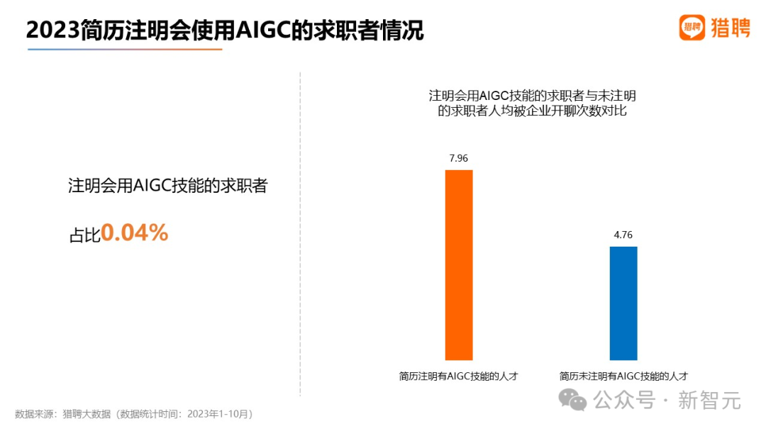 根据猎聘最新发布的「2023年度就业趋势数据报告」,2023年1-10月期间,要求掌握AIGC的职位不仅在数量同比增长了179.19%,而且招聘薪资明显高于无此要求的同等岗位。