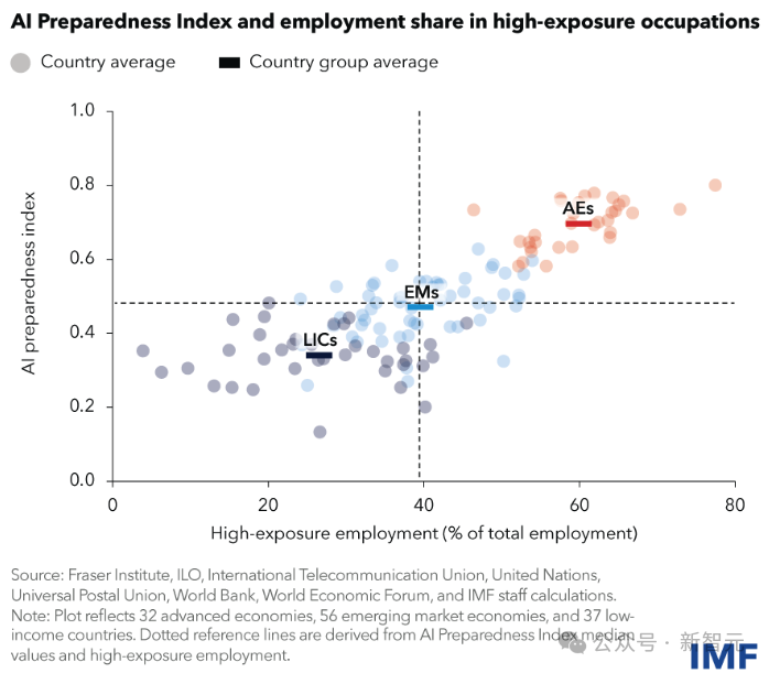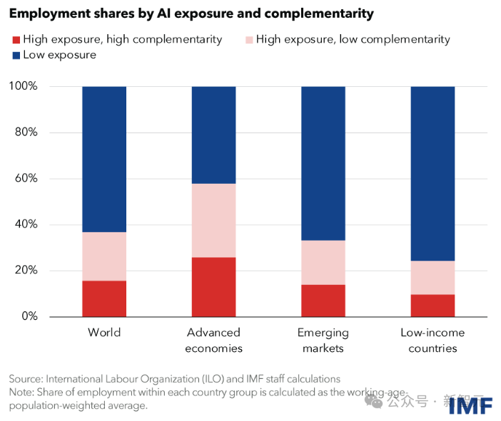 其中,发达经济体将有60%的工作岗位受到影响,在新兴市场和国家中,这个数字大概是40%,而低收入国家则下降到26%。