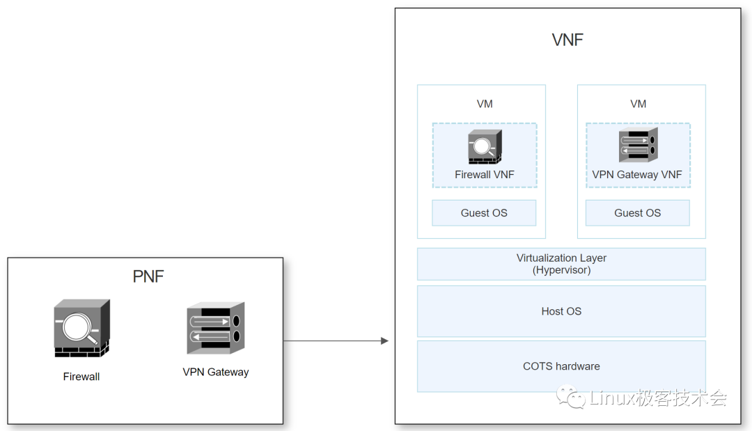 如图所示Firewall、VPN Gateway 两台PNF,需要使用两台虚拟机来运行此 VNF。此外,虚拟机的管理程序(Hypervisor)将物理服务器分割成了多个逻辑服务器(VM)。同时,虚拟机还需要在宿主机之上为每台虚拟机运行Guest OS操作系统,这对服务器来说是一个额外的负担。
