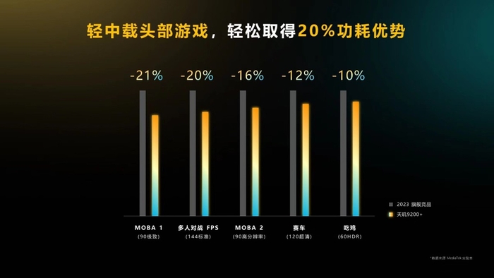 天玑9200+采用了最适合游戏运行的CPU设计,在性能提升的同时,也有着非常出色的能效表现,相同功耗下,天玑9200+性能更好,相同游戏天玑9200+功耗更低。根据官方给出的信息,在多款热门游戏中,天玑9200+对比竞品功耗要低10-20%,而在重载光追游戏上,功耗也会低10%。