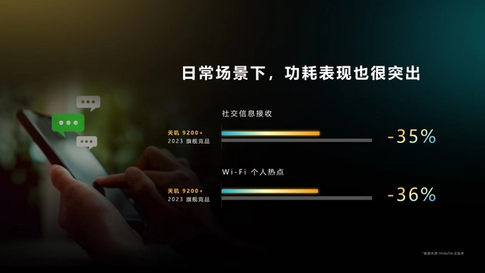 除了游戏场景外,在一些日常使用场景,天玑9200+同样有着更低的功耗,其中社交信息接收达到了35%,WiFi个人热点为36%。