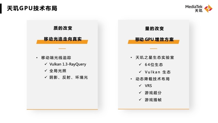 MediaTek基于移动端游戏等应用的发展特征,提出移动GPU增效方案,针对GPU性能提升,搭配GPU周边技术,实现保持系统资源平衡的基础上,满足高复杂度内容的计算需求。从性能和能效提升、生态发展、平台软件优化、自研算法等不同维度布局技术。