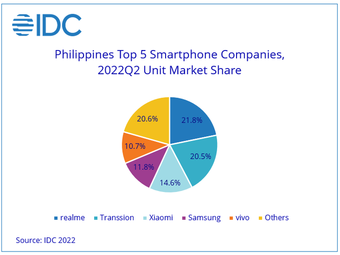 【天极网手机频道】近日,国际市场调研机构IDC发布了2022年第二季度菲律宾智能手机市场统计数据。菲律宾智能手机出货量相比去年同期下降了一些,下降幅度为3%。不过在第二季度430万部的出货量中,斩获前五的手机厂商有四家来自中国。位居前五的手机厂商分别为realme、传音、小米、三星和vivo,市场份额分别为21.8%、20.5%、14.6%、11.8%和10.7%,其他厂商则共同占据了20.6%的市场份额。
