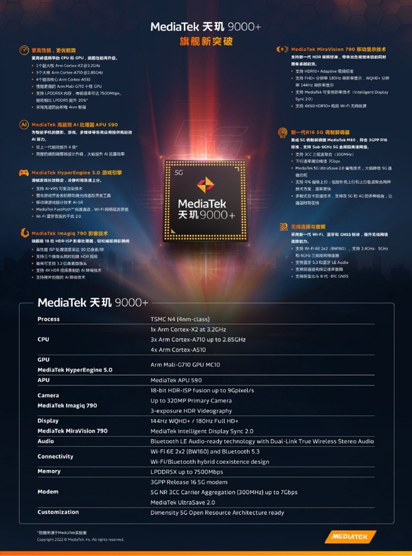 除了CPU和GPU上的小升级外,天玑9000+与天玑9000在其它方面保持了一致,集成了MediaTek 第五代AI处理器APU590;支持LPDDR5X内存,速率可达7500Mbps;采用旗舰级18位HDR-ISP图像信号处理器,最高可支持3.2亿像素摄像头,可实现三个摄像头同时拍摄18位HDR视频,高性能ISP处理速度可达90亿像素/秒,支持4K HDR视频录制的AI降噪;符合新一代3GPP R16 5G标准,支持Sub-6GHz 5G全频段网络,支持3CC三载波聚合(300MHz),下行速率理论峰值可达7Gbps,还有MediaTek 5G UltraSave 2.0 省电技术,可大幅降低5G通信功耗;支持Wi-Fi 6E、新型北斗III代-B1C GNSS和蓝牙5.3技术等。