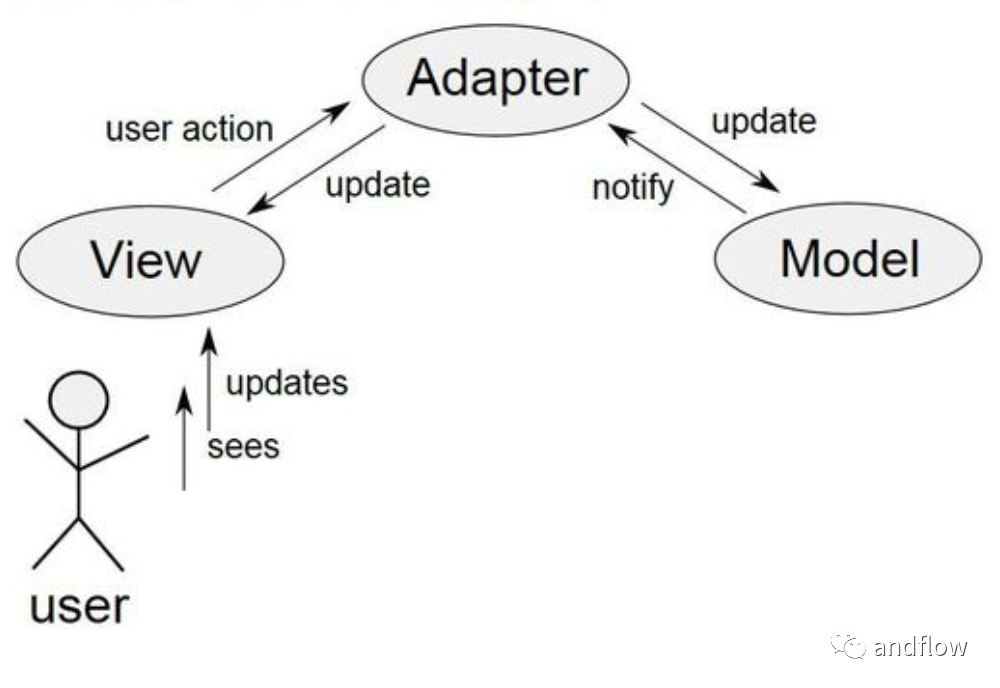 MVA(全称:Model View Adapter),MVA和MVC都试图解决同样的问题,但MVA与MVC有一个区别:MVC的模型、视图和控制器的关系形成一个三角形,模型、视图和控制器作为顶点,一些信息可以在模型和视图之间流动,而不受控制器的直接控制;而MVA使用适配器(Adapter)代替控制器,MVA通过线性地安排模型、适配器或中介控制器和视图,而没有模型和视图之间的任何直接连接,在这种架构中,模型和视图不知道彼此的存在。在单个模型和视图之间,可以有许多适配器,它们修改来自模型的信息在视图中的呈现方式。