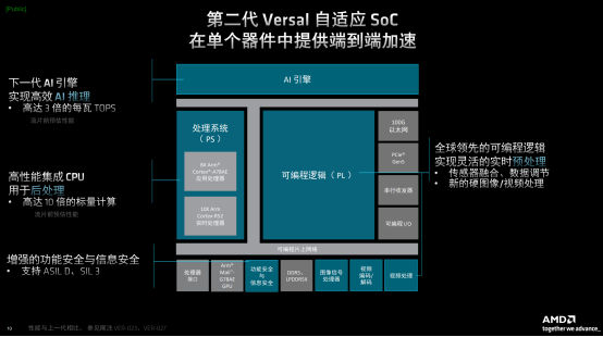 据介绍,第二代Versal自适应SoC采用了下一代AI引擎,在实现高效AI推理的同时,提供了高达3倍的每瓦TOPS。由于集成了更高性能的CPU,在后处理过程中实现了高达10 倍的标量计算能力。除此之外,第二代Versal自适应SoC还进一步增强了安全能力,支持ASIL D、SIL 3等。