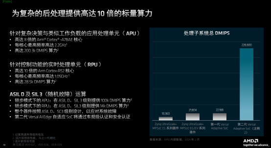 在后处理阶段,第二代Versal AI Edge系列SoC能够为复杂的后处理提供高达10倍的标量算力,实现高达8倍的Arm Cortex-A78AE核心,每个核心最高频率高达2.2GHz,并且有高达200.3K的DMIPS算力。在控制功能的实时处理单元中,RPU可以实现高达10倍的Arm Cortex-R52核心,每个核心最高频率高达1.05 GHz,提供高达28.5K的DMIPS算力。