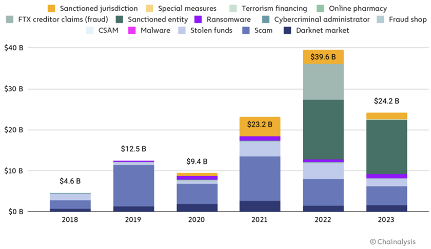 根据加密货币追踪公司Chainalysis最新发布的《2024年加密货币犯罪报告》。2023年是加密货币复苏的一年,该行业从2022年的丑闻、市场暴跌中恢复过来,市场热度逐步回升,与加密货币有关的网络犯罪也再次活跃。