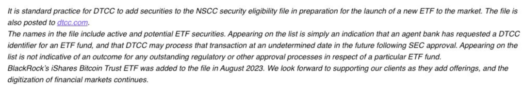 不过 DTCC 也强调,将证券添加到 NSCC 证券资格文件中,为向市场推出新 ETF 做准备是「标准做法」,「出现在名单上并不表示特定 ETF 基金的任何未完成的监管或其他审批程序的结果」。