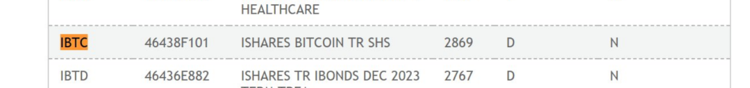 10 月 24 日凌晨,先是彭博高级 ETF 分析师 Eric Balchunas 发推称,贝莱德的 iShares 比特币信托(iShares Bitcoin Trust)已被列举在美国证券存托清算公司(DTCC)交易所交易基金(ETF)清单上,交易代码为 IBTC,并表示这是「推动比特币现货 ETF 上市的一个环节」。