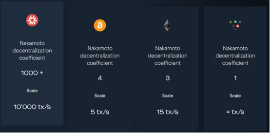 通过服务器或集中式机器人对智能合约进行集中管理进一步放大了这个已经存在的问题,因为服务器可能被黑客入侵,而且机器人可能会出错,以及集中式系统的可扩展性也是有限的。最终,这种集中控制限制了去中心化的目标。区块链中的可扩展性和去中心化之间的权衡可以使用中本分散系数(Nakamoto Decentralization Coefficient:简称“NDC”)进行衡量。于是,专门引入自主智能合约的概念,以便解决现有区块链中的去中心化和可扩展性问题。下图显示,与比特币区块链、以太坊区块链和其他区块链相比,通过自主智能合约,Massa区块链的去中心化和可扩展性都得到了极大改善。
