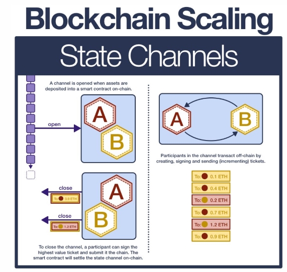从以太坊的角度来看,一个状态通道是2笔交易(每个参与者):开启和关闭状态通道。这些交易代表了更多发生在链下的计算,但最终被结算到主网。