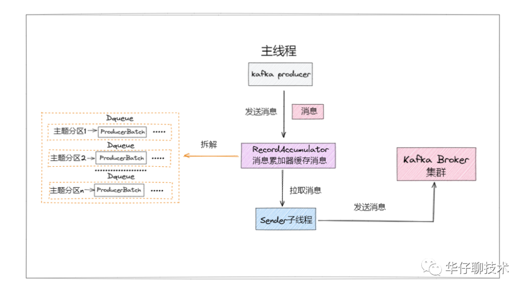 那么分拣员就是指 RecordAccumulator,而货箱以及各自所属的堆放区域,就是 RecordAccumulator 中缓存消息的地方。所有封箱的都会等待 sender 来取货发送出去。