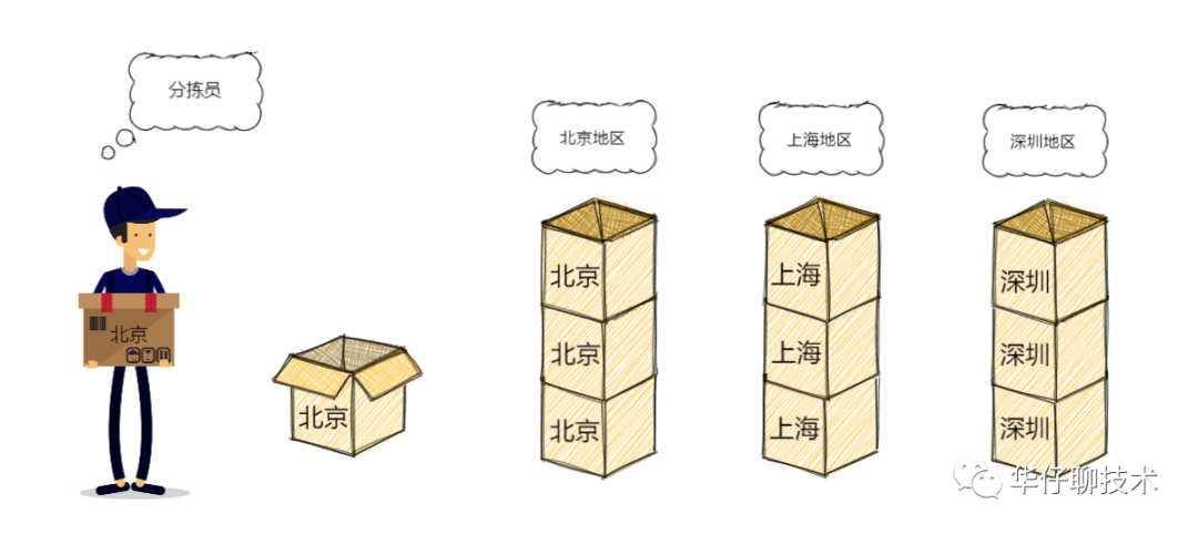 上图是一个快递仓库,堆满了货物。可以看到分拣员把不同目的地的包裹放入对应目的地的货箱,每装满一箱就放置在对应的区域。