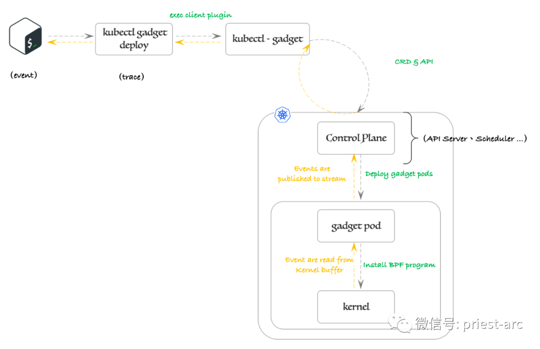 3、为了展现这些事件数据,Inspektor Gadget 使用了内部的 kubectl exec API 接口。kubectl exec 是 Kubernetes 的一个命令行工具,用于在容器中执行命令。Inspektor Gadget 利用这个 API 接口来与容器中运行的用户空间组件进行通信,并从 Stream 中获取事件数据。