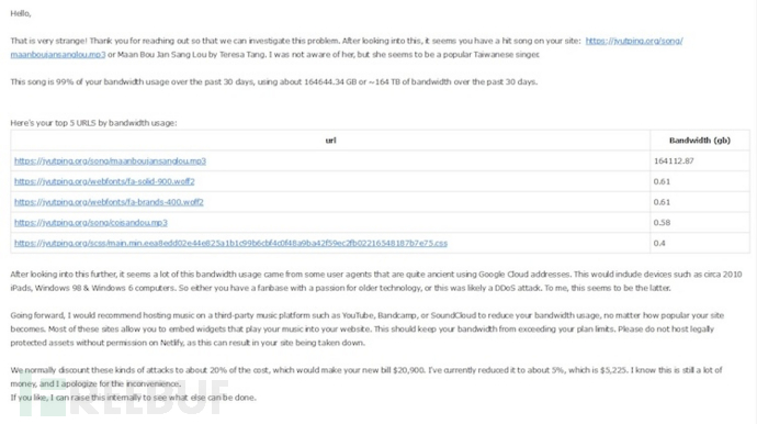 据了解,被攻击的网站jyutping.org存储了一套粤语的罗马拼音方案、一些课程和教程。在联系客服确认情况后,发现网站内有一个mp3文件(一首邓丽君演唱的非常火的歌曲《满船尽载一船愁》)被下载了数百万次,累计使用了164.1TB的宽带流量。在过去30天内,占据了该网站带宽使用量的99%。
