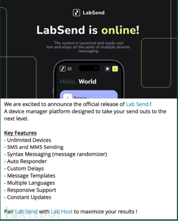 LabHost 在 10 月中断后重新开始运营时,还推出了一种名为 "LabSend "的新短信垃圾邮件发送工具,该工具在短信中嵌入了指向 LabHost 钓鱼页面的链接。