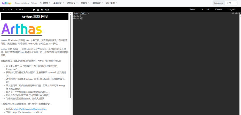 一个是 Arthas 官网:https://arthas.aliyun.com/doc/,官方文档对 Arthas 的每个命令都做出了介绍和解释,并且还有在线教程,方便大家学习和熟悉命令。
