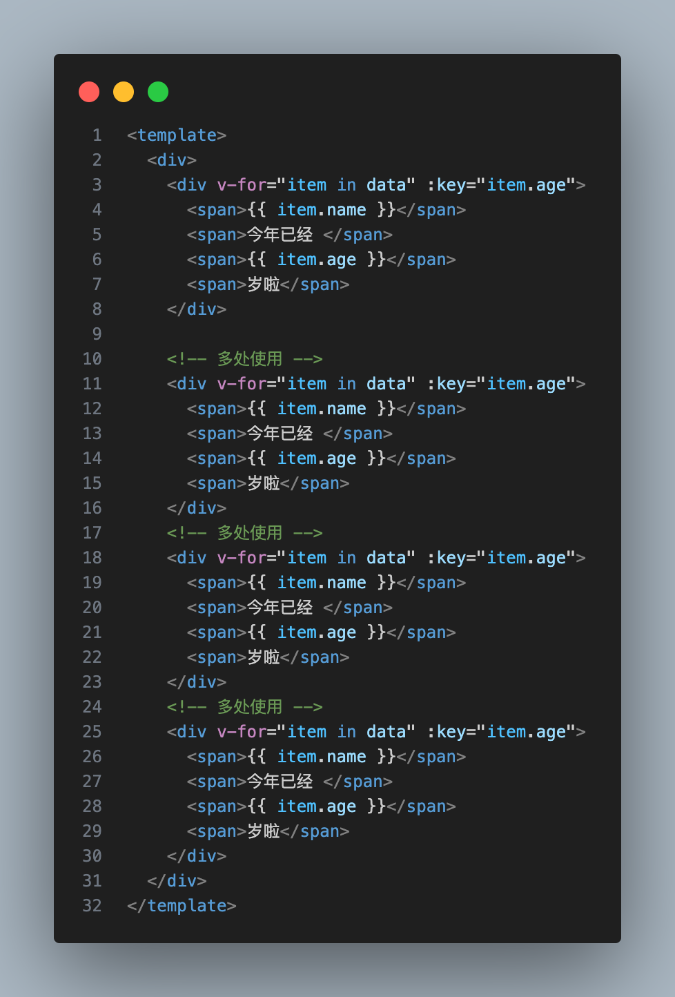 其实就是一个普通的不能再普通的循环遍历渲染的案例,咱们往下接着看,如果这样的遍历在同一个组件里出现了很多次,比如下方代码: