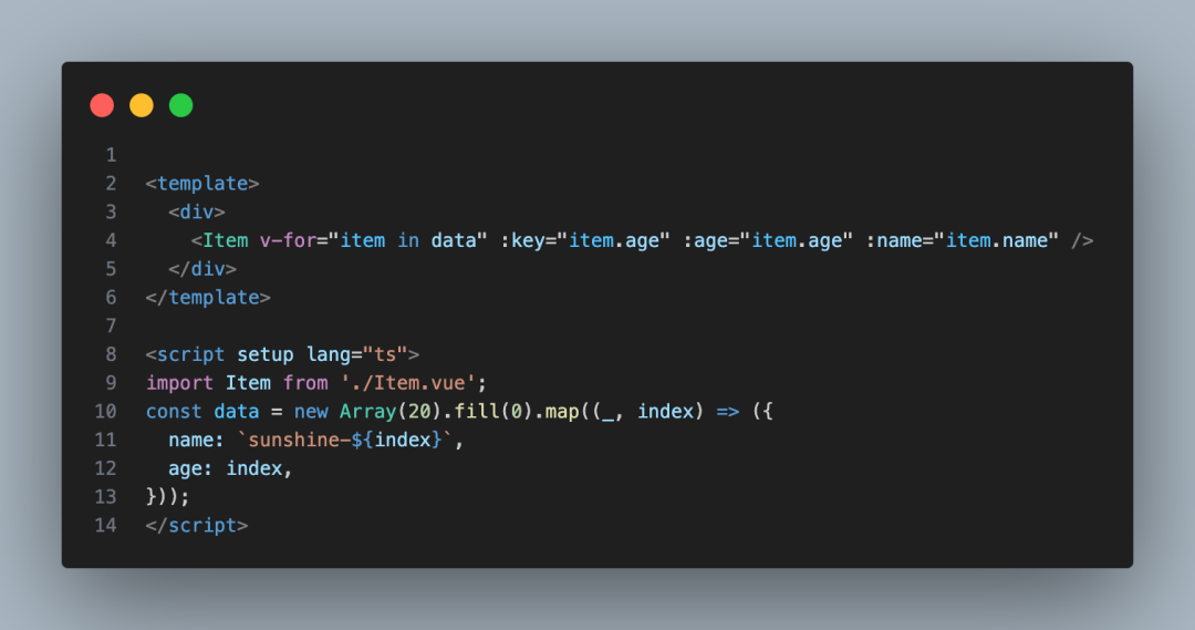 这个时候我们应该咋办呢?诶!很多人很快就能想出来了,那就是把循环的项抽取出来成一个组件,这样就能减少很多代码量了,比如我抽取成 Item.vue 这个组件: