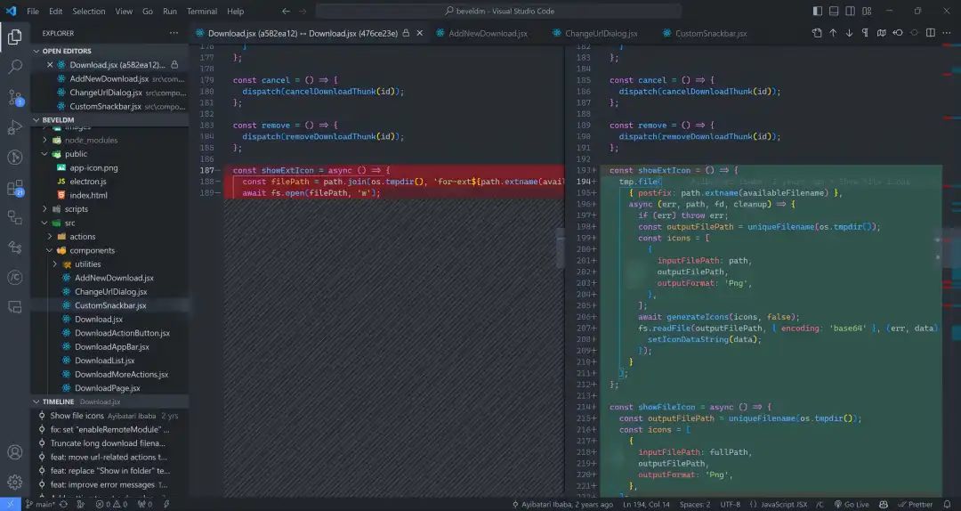 VS Code 还在时间轴视图或源代码控制中使用分割视图,来显示不同文件版本之间的更改。