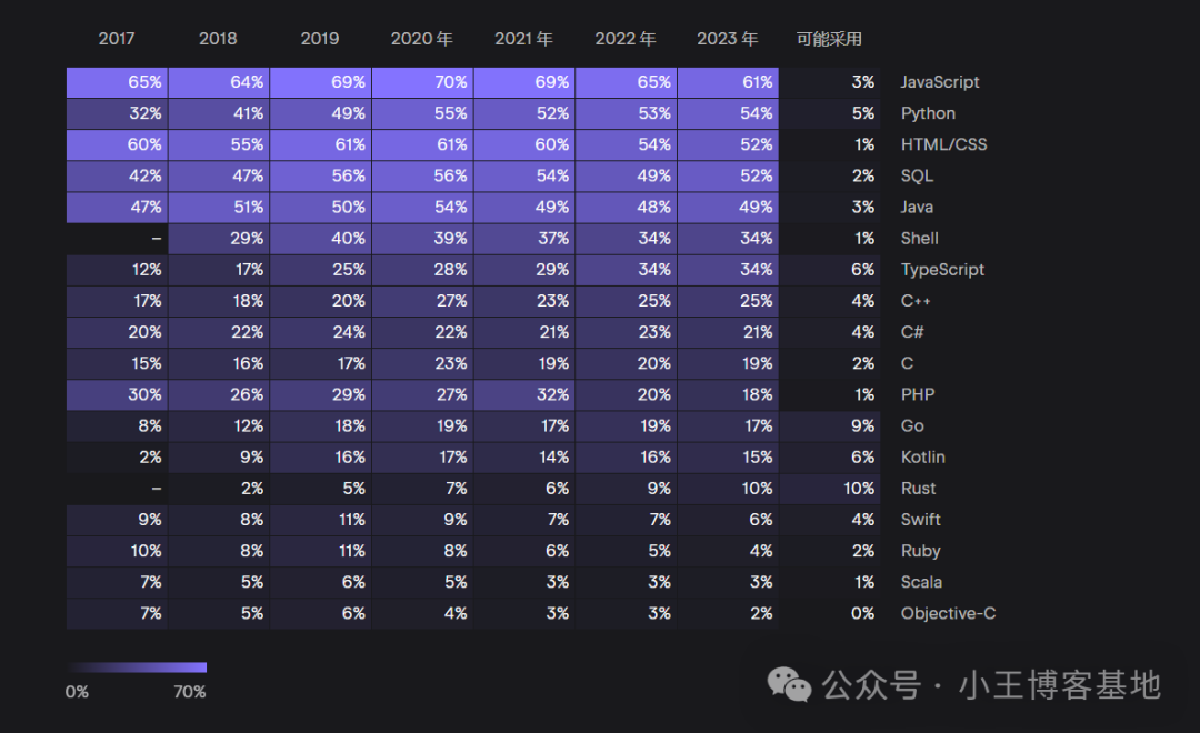 过去三年,排名前三的语言保持不变,但 JavaScript 的份额一直在下降。可以合理假设,它将继续小幅下降,因为 JavaScript 程序员表示学习另一种语言的可能性比其他程序员更高。